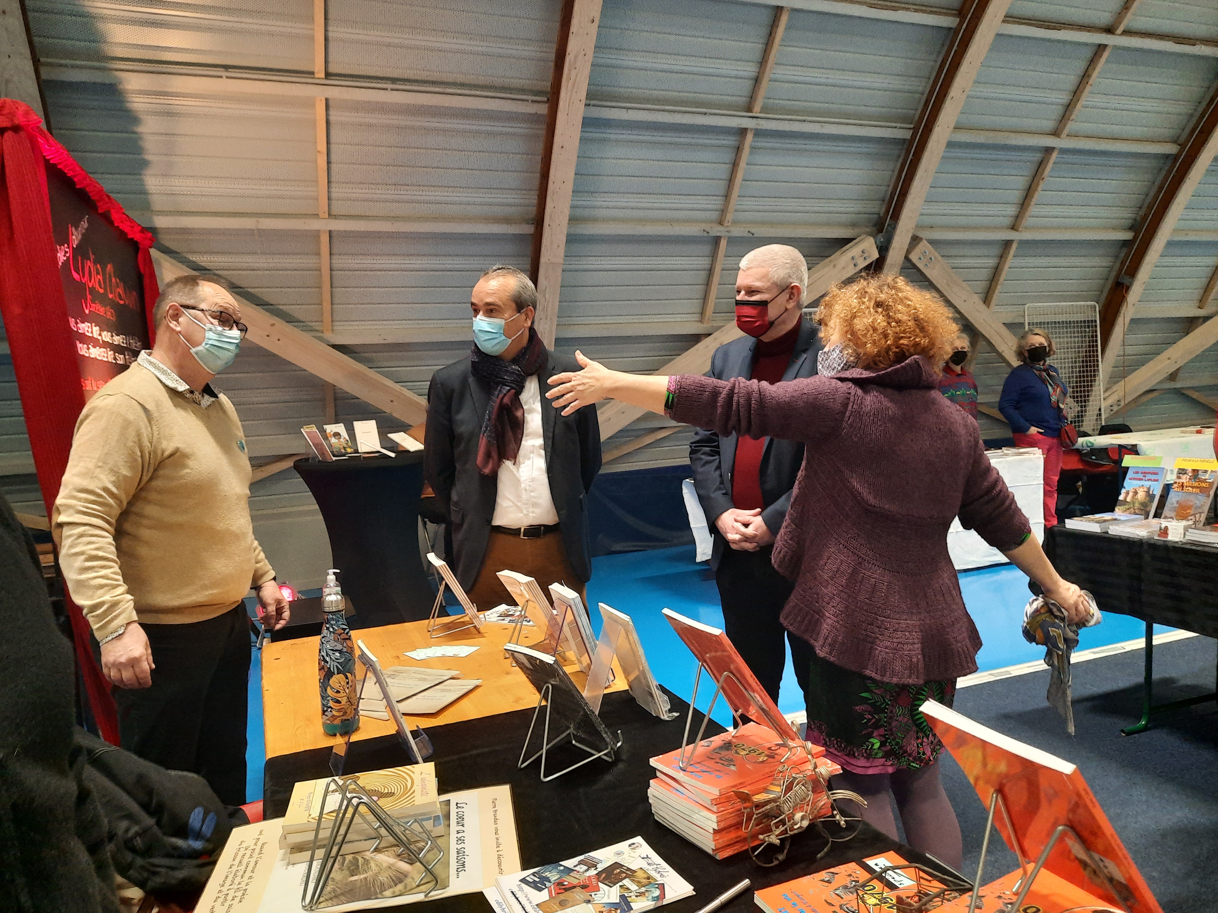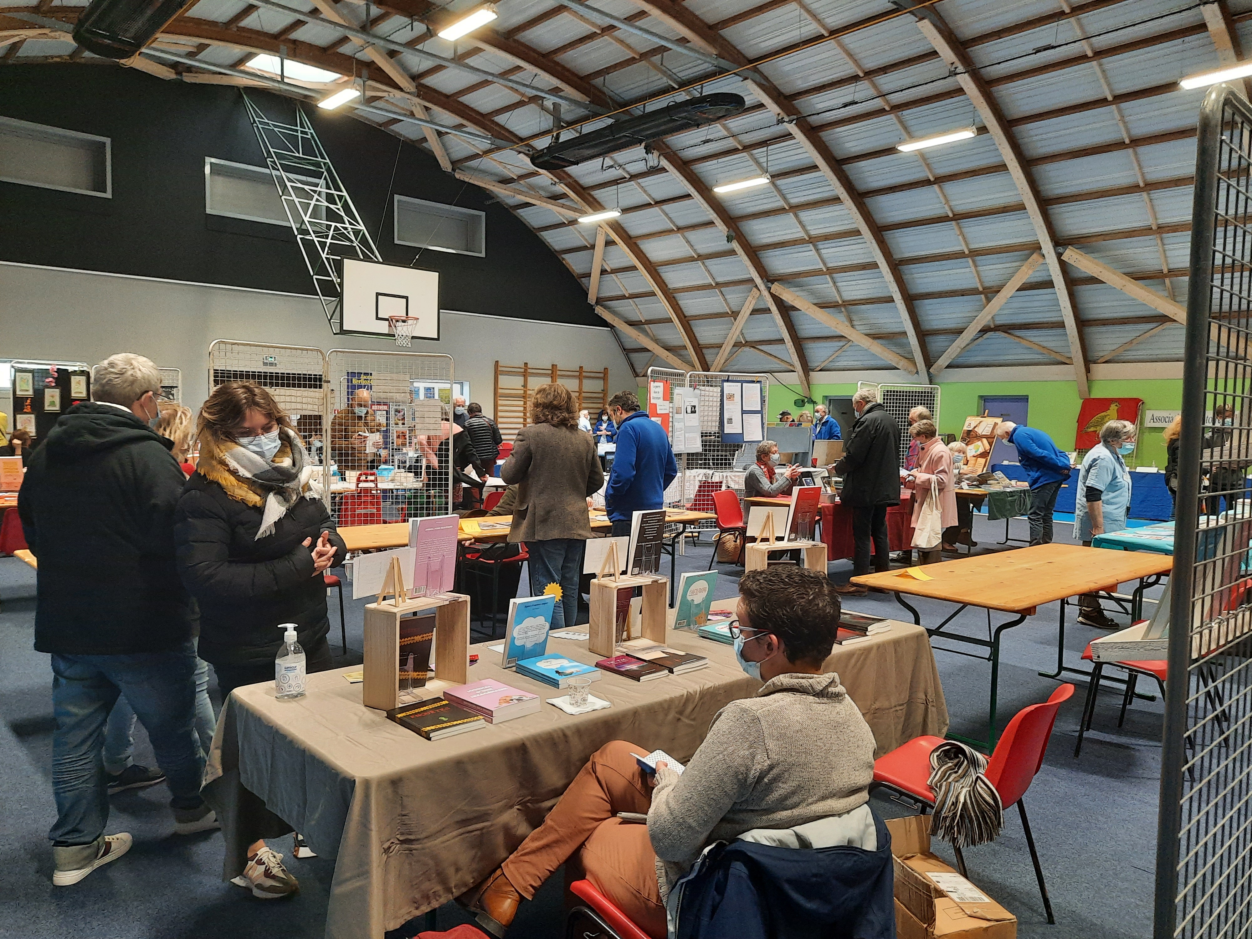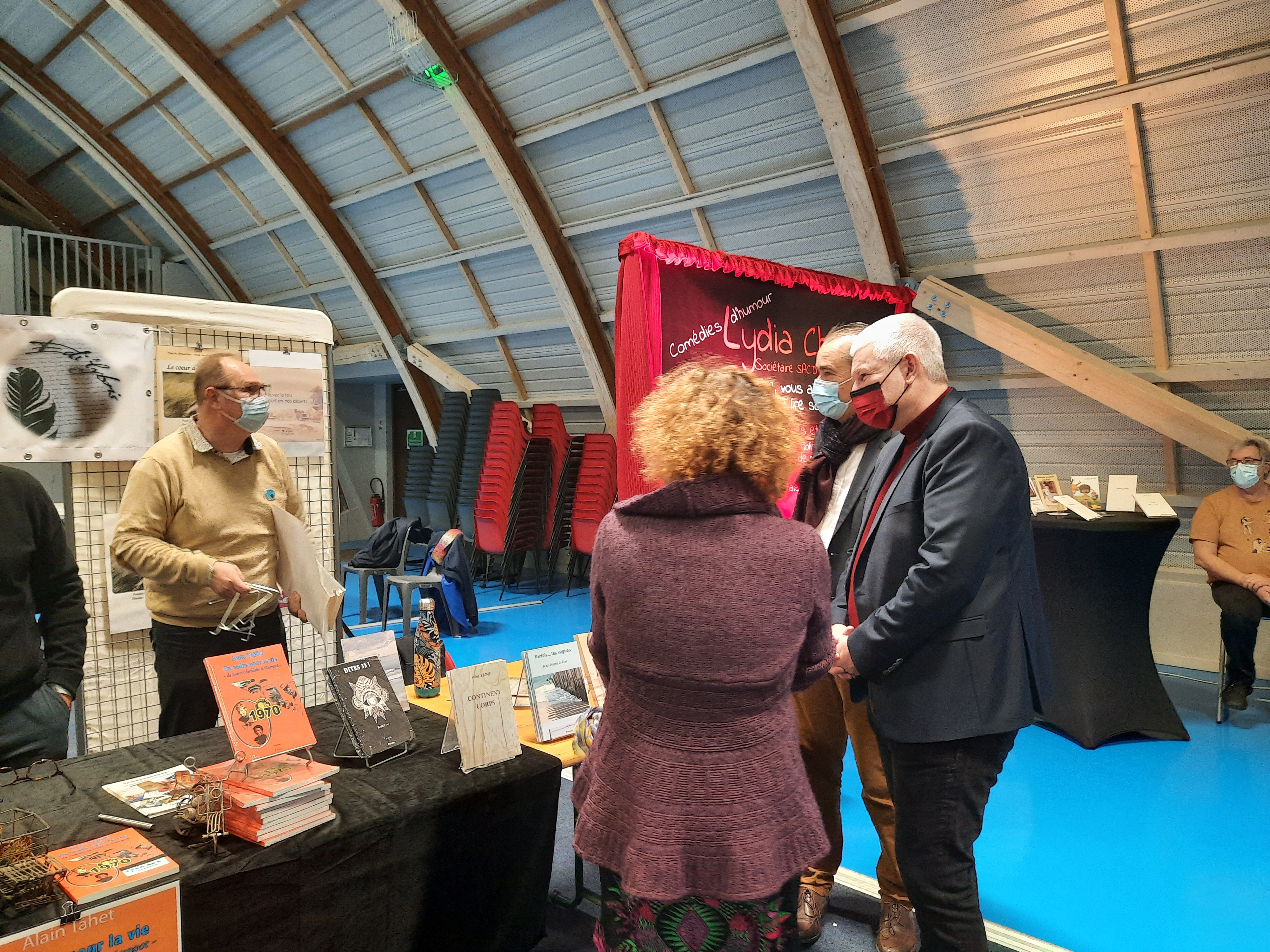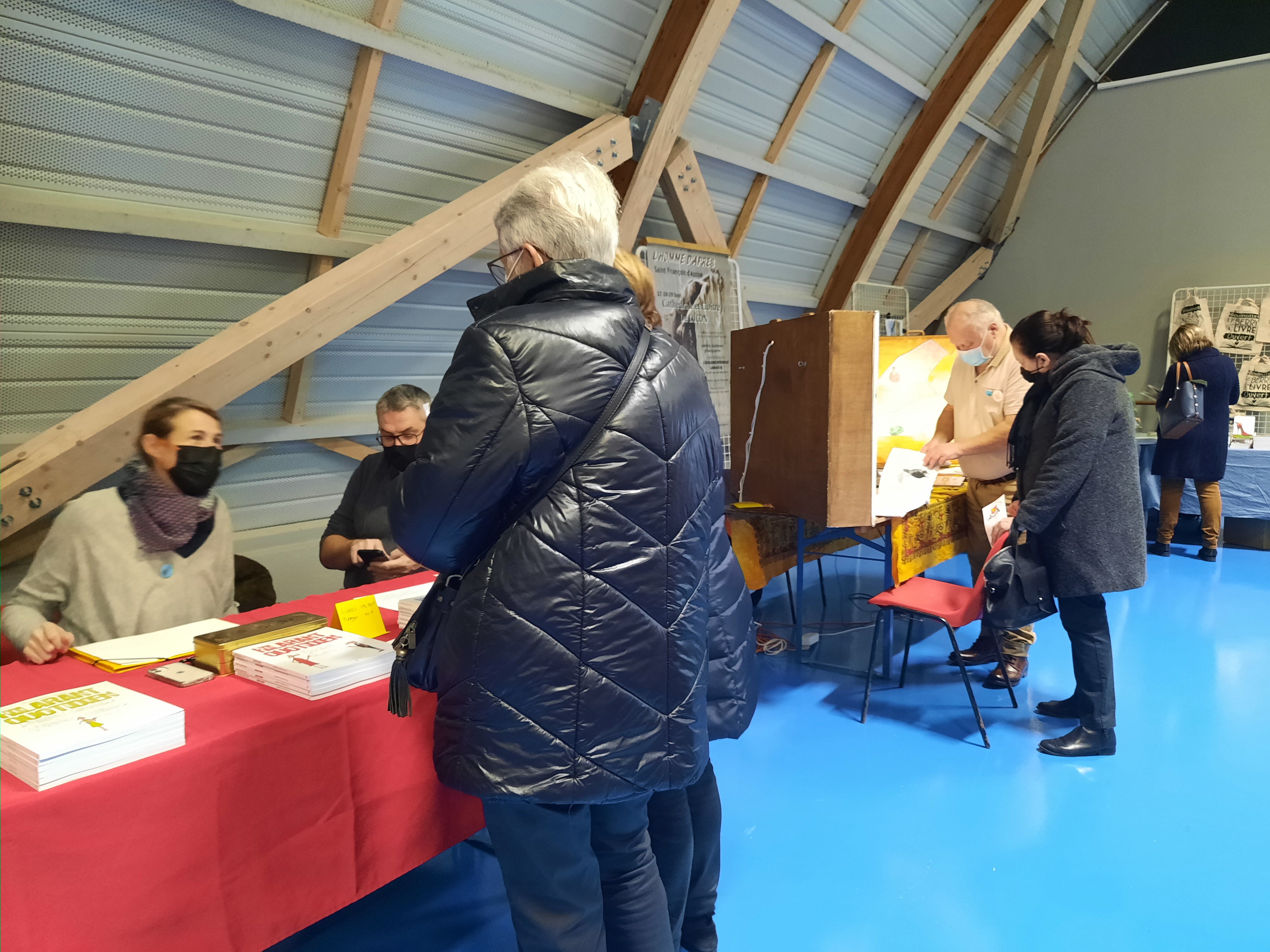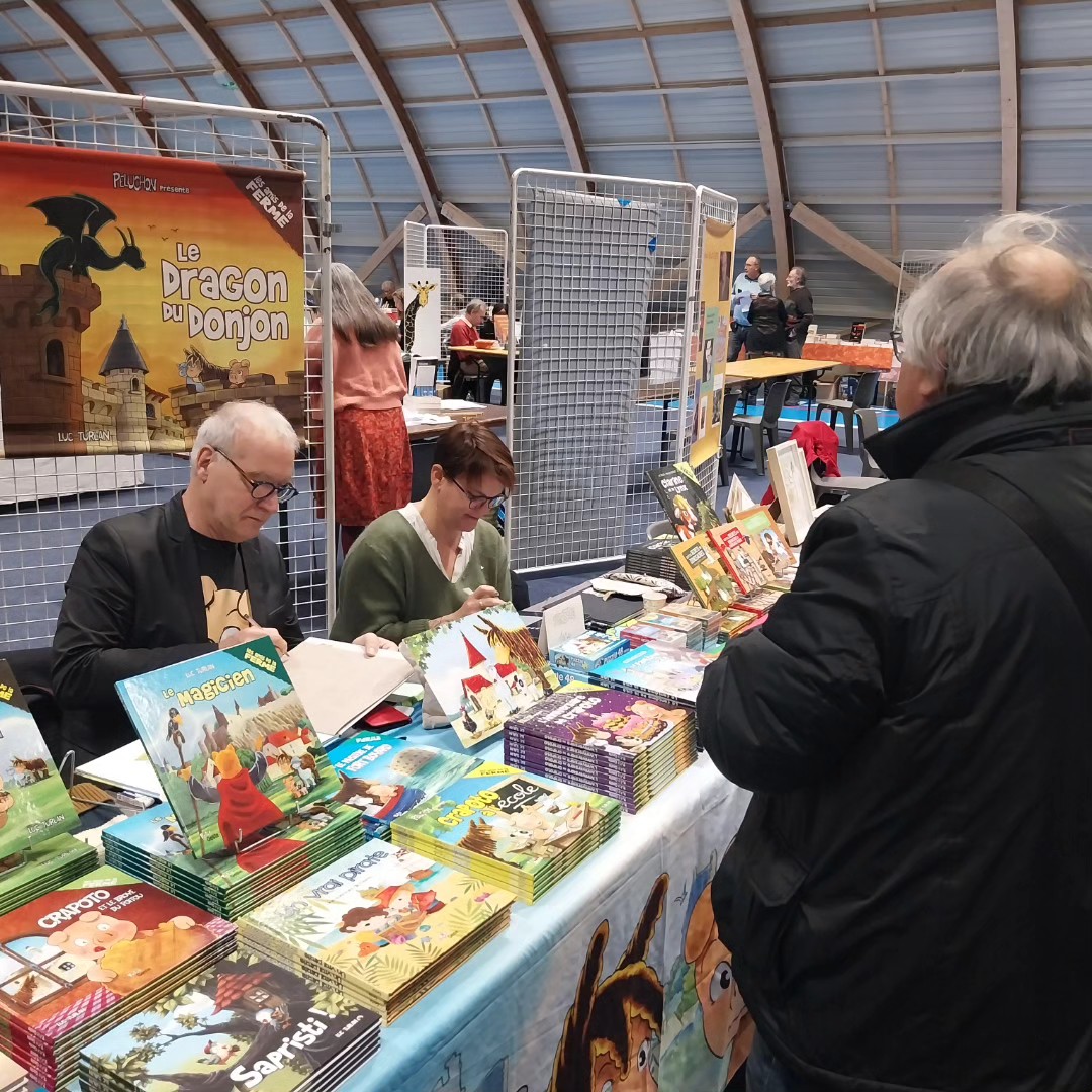 Le Dimanche s’est tenu le salon du livre local (3è édition) avec auteurs, illustrateurs, éditeurs et métiers du livre (reliure, calligraphie…) venus de max 50km autour du village. C’était l’occasion de remettre les prix aux lauréats de la dictée par le parrain Luc Turlan (merci aux exposants pour les lots, de beaux et nombreux livres ont honoré les lauréats), l’ouverture du salon a été réalisée en présence de notre député Olivier Falorni et le maire Jean-Luc Algay. Le prix de la plus belle écriture a été choisi à l’aveugle par Luc et son illustratrice. 2 enfants ont participé et on été récompensés. Le conseil d’administration s’était réuni pour préparer ce moment, une commission de sélection s’était concertée pour choisir une palette d’auteurs variés. La déco de l’espace ST Exupéry a été réalisée en collaboration avec l’Atelier Peinture du village.